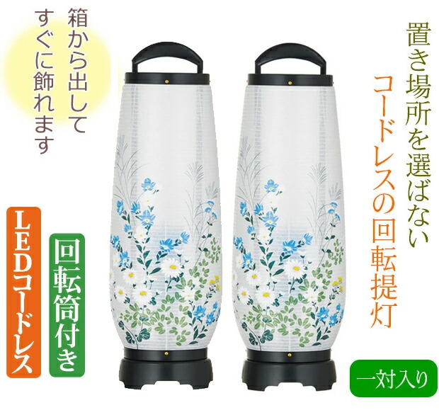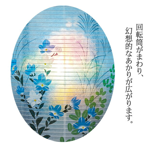 火袋には桔梗と萩のやさしい絵柄が描かれ、スイッチを入れると回転筒がくるくると回転し幻想的なあかりが広がります。 _x000D_