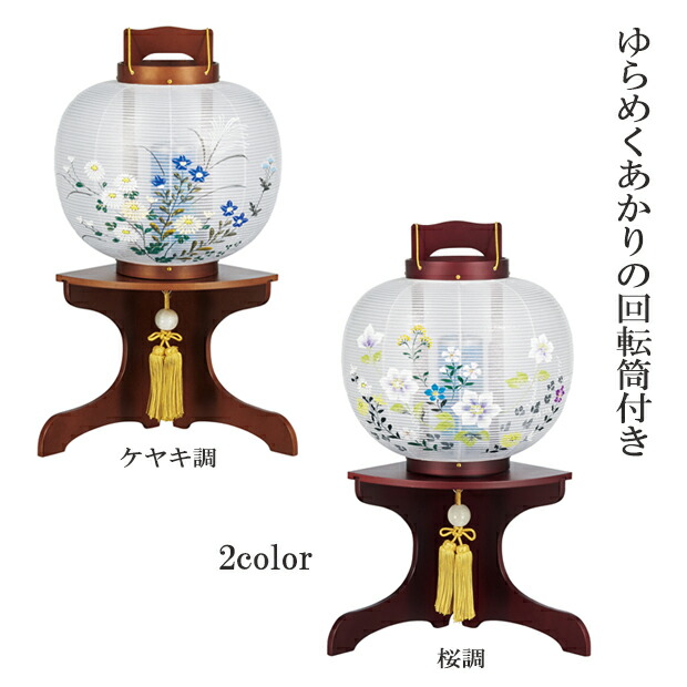 ゆらめく明かりの回転提灯と、ほのぼのとした行灯2通りの使い方ができる、回転筒付きの木製提灯です。 和紙張りの火袋には菊の花が描かれ、骨組みは天然木で仕上げた上品で明るい印象です。 ケヤキ調と桜調の2色からお選びください。 スイッチを入れると電球の熱で温められた空気で回転筒がくるくる回り、大変幻想的です。また、回転筒をはずせばやさしい灯りの行灯としてお使いいただけます。 お好みのあかりでご先祖様をお迎え下さい。 |