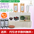 木製の二段祭壇と、初盆用のミニ提灯、人気の回転提灯みやび、心まちセットにお仏膳、お供えを盛る供物台、お迎え、送り火に使うほうろくをセットしました。並べるだけで盆棚が完成します。