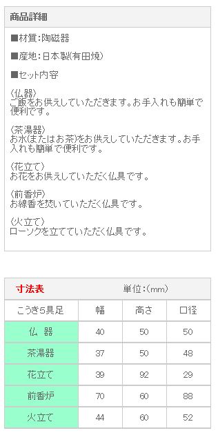 ■材質:陶磁器 ■産地:日本製(有田焼) ■セット内容 〈仏器〉 ご飯をお供えしていただきます。お手入れも簡単で便利です。 〈茶湯器〉 お水(またはお茶)をお供えしていただきます。お手入れも簡単で便利です。 〈花立て〉 お花をお供えしていただく仏具です。 〈前香炉〉 お線香を焚いていただく仏具です。 〈火立て〉 ローソクを立てていただく仏具です。