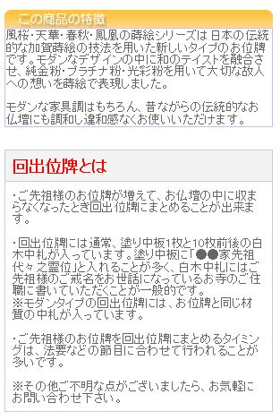| <ご注意> 文字彫りについてはショッピングの最終画面で入力していただきます。ショッピングカートの最終画面に【お位牌文字彫り依頼フォーム】へのリンクが表示されますので、必ずこちらをクリックしてください。 詳しくは「お位牌のご注文について」をお読みください。 |