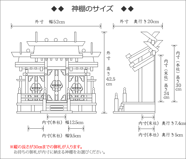 外寸法:巾52×高さ42,5×奥行き20(cm) 内寸法:本社/巾12,5×高さ30×奥行き7,4(cm) 末社/巾9,5×高さ24×奥行き5(cm)