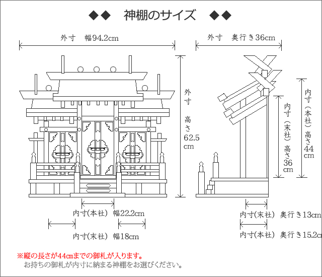 外寸法:巾94,2×高さ62,5×奥行き36(cm) 内寸法:本社/巾22,2×高さ44×奥行き15,2(cm) 末社/巾18×高さ36×奥行き13(cm)